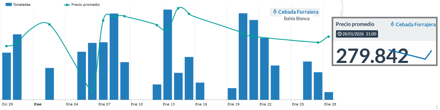 El valor promedio de la cebada forrajera negociado hoy con entrega en las terminales de Bahía Blanca se ubicó en 279.842 $/tonelada (191,4 u$s/tonelada al dólar MEP) luego de registrar un máximo de 288.800 $/tonelada el pasado 14 de enero, según datos de Sio Granos.