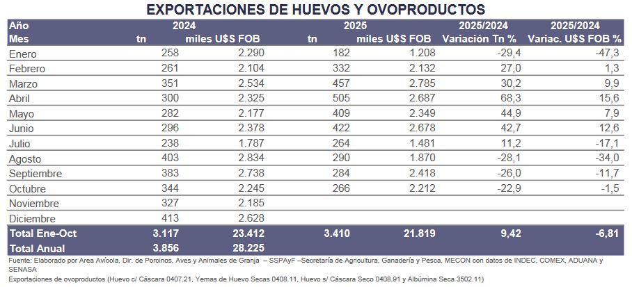 Este año las exportaciones de huevos y derivados crecieron en términos de volumen, pero cayeron en cuanto a divisas por menores precios de venta.