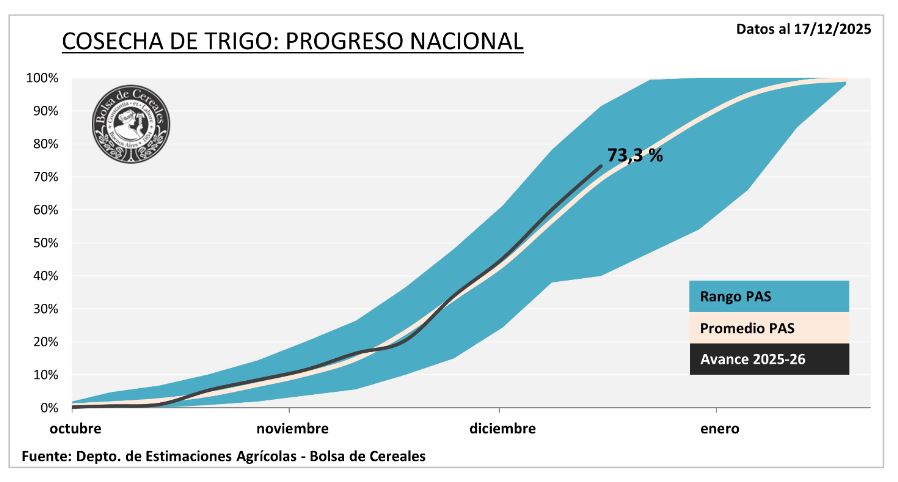 Ya se cosechó en la Argentina el 73% del área nacional de trigo para generar una oferta de 20,2 millones de toneladas sobre un total estimado de 27,1 millones por la Bolsa de Cereales de Buenos Aires.
