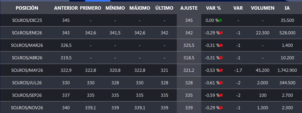 Al pasado 26 de noviembre –según el último dato oficial disponible– exportadores e industria aceitera habían comprado 4,40 millones de soja 2025/26 (del cual 1,91 millones no tenía precio hecho), al tiempo que las posiciones abiertas de los contratos de Soja Rosario A3 del ciclo 2025/26 suman actualmente 2,10 millones de toneladas.