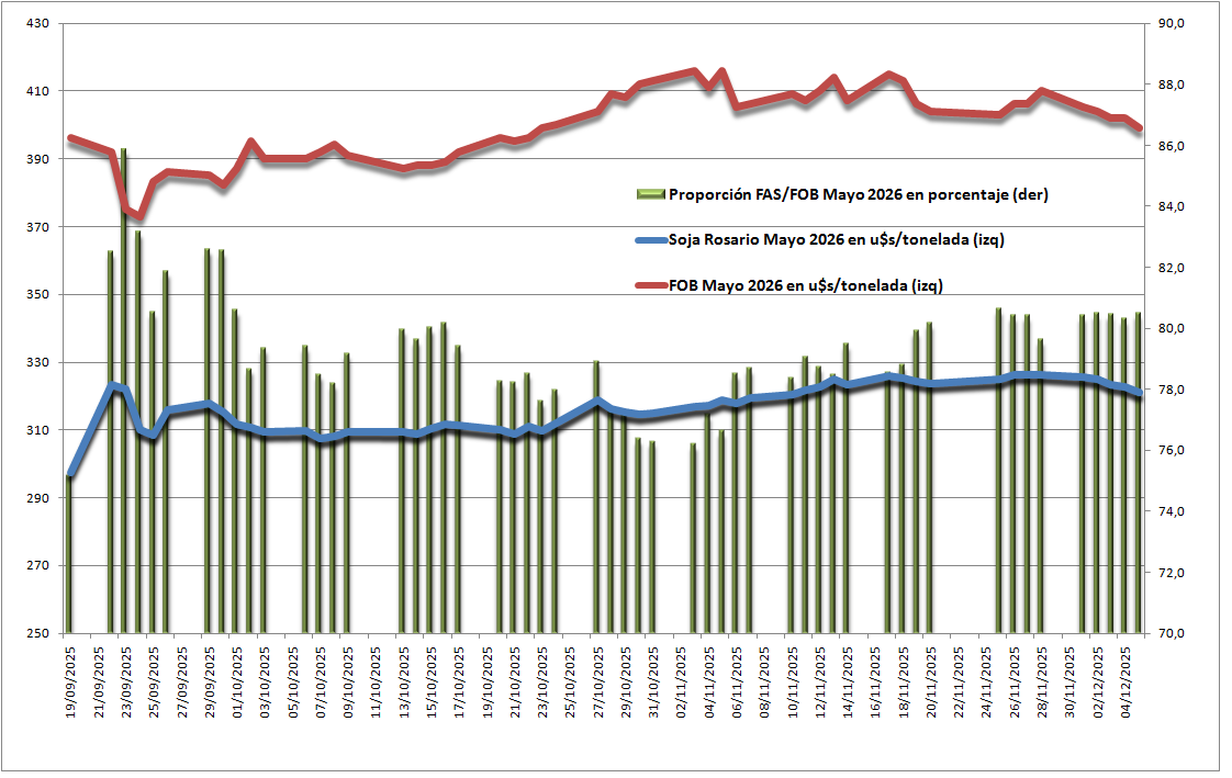 Al comparar esos valores con los precios FOB del poroto de soja de cada una de las jornadas de la semana –determinado por la Secretaría de Agricultura para embarque en mayo de 2026–, se advierte que los mismos son equivalentes a más del 80% del precio de exportación.