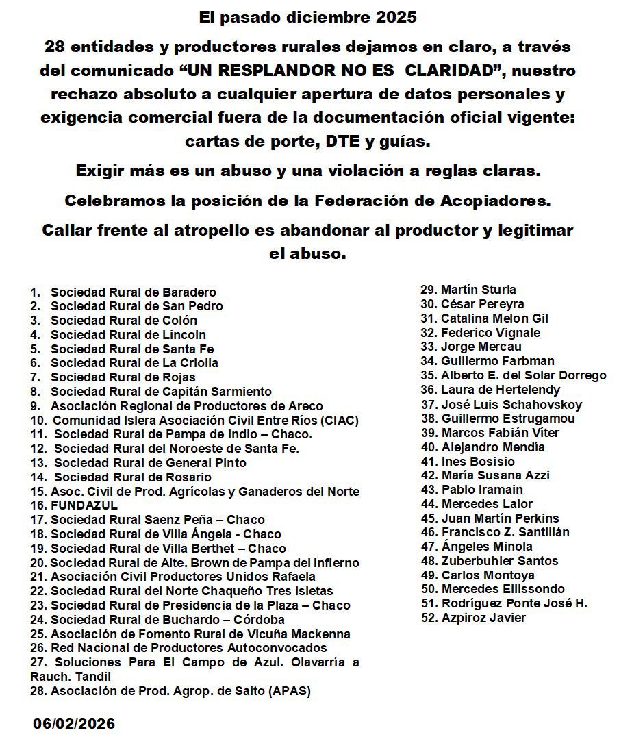 En un comunicado precipitado pero que igual recogió bastantes adhesiones del eslabón primario de la cadena, las 28 sociedades rurales expresaron su “rechazo absoluto a cualquier apertura de datos personales y exigencia comercial fuera de la documentación oficial vigente: cartas de porte, DTE y guías” para la venta de granos o hacienda.