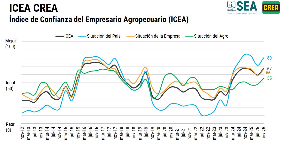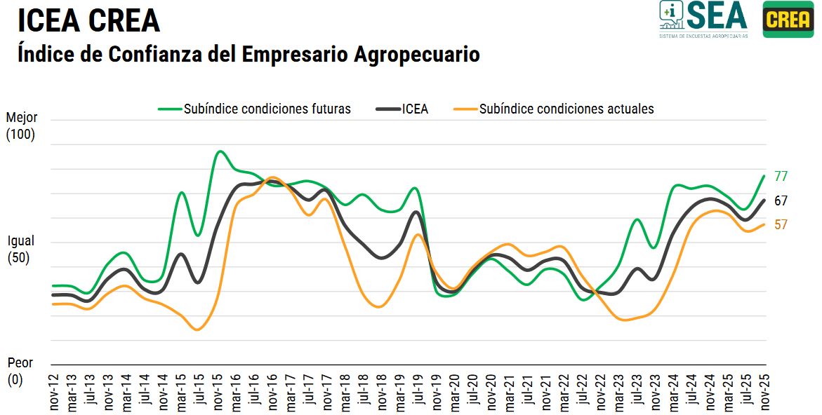 La encuesta realizada por CREA en el pasado mes de noviembre evidencia una recuperación marcada del índice de Confianza del Empresario Agropecuario (ICEA), lo que se explica principalmente por mejores expectativas sobre la evolución de la economía argentina.