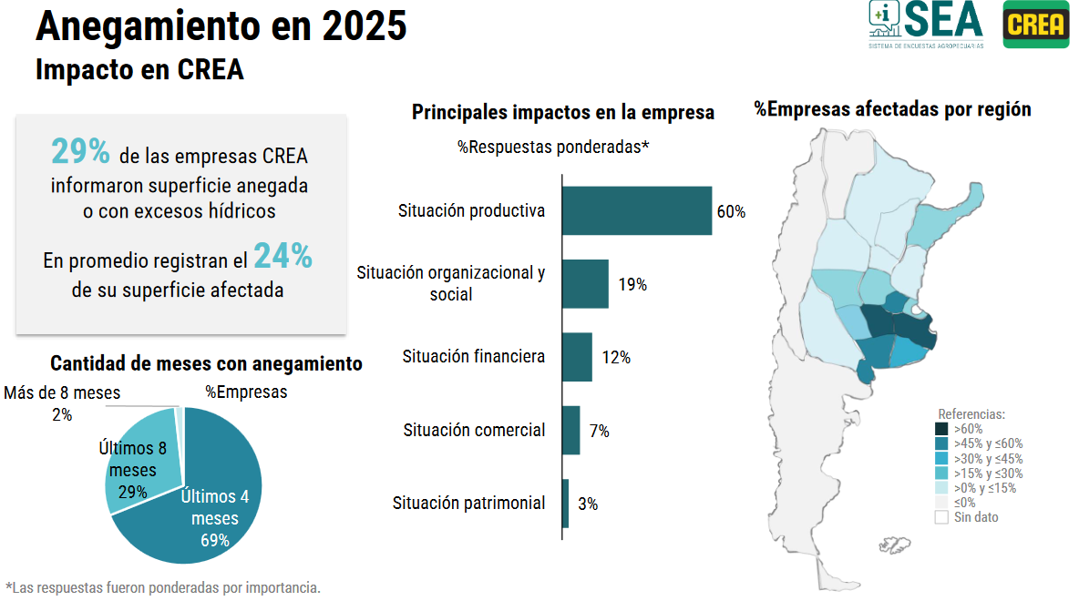 Los excesos hídricos registrados en los últimos meses representan una situación crítica que afecta a muchas regiones y empresas agropecuarias: un 29% de los encuestados presentan anegamientos que comprometieron en promedio un 24% de la superficie productiva. Los mayores inconvenientes se registran en la provincia de Buenos Aires.