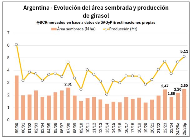 La Bolsa de Comercio de Rosario (BCR) estima que la producción de girasol argentina en 2025/26 podría ser de 5,11 millones de toneladas con una oferta total, considerando el remanente de la campaña previa de, 6,13 millones.