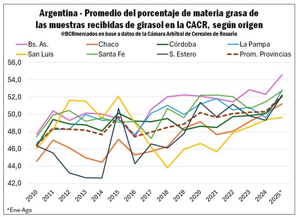 En el siguiente gráfico se presenta el porcentaje promedio de materia grasa de las muestras recibidas por la Cámara Arbitral de Cereales de Rosario según las provincias de origen.