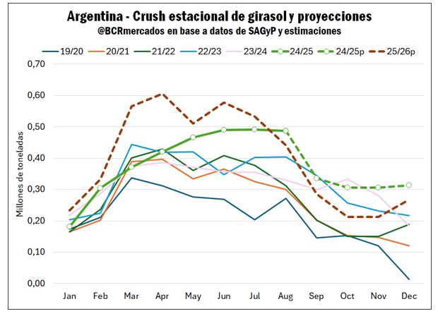 Por otro lado, si se hace foco en las proyecciones de la próxima campaña comercial 2025/26, el mercado espera que se utilice más capacidad instalada para procesar girasol entrado el año 2026. “Si esto se acompaña de un buen nivel productivo y stocks iniciales crecientes, las expectativas nos marcan que el ritmo de procesamiento podría inclusive superar el gran año de 2025, con posibilidades de presionar con un buen nivel de oferta de aceite y harina en los mercados globales entre marzo y agosto de 2026”, anticipa la BCR.