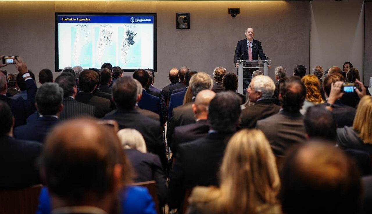 Mientras tanto, desde un auditorio en el exterior, el ministro de Desregulación y Transformación del Estado celebra el “éxito” del modelo.