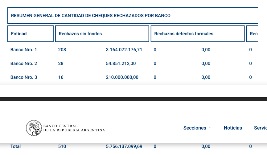 Esa lista es de 510 cheques rechazados desde el 29 de septiembre hasta ahora, por la friolera de 5.756.137.099,69 pesos. Es más incluso el dinero impago que el que este empresario le reclama a la cooperativa Familias Argentinas, unos 4.200 millones de pesos.