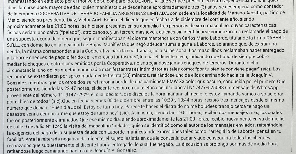 Pero aquí también el contador expone contradicciones, pues en su descargo a la Provincia presentó una copia de una denuncia realizada el 18 de diciembre (es decir seis días antes del 24 de diciembre) ante la Estación Policial de San Pedro del Ministerio de Seguridad bonaerense. En ese escrito, que aquí se publica parcialmente para no exponer sus datos, Belseny hace referencias a una serie de amenazas sucedidas desde el 2 de diciembre, por gente enviada por Laborde para exigirle por el dinero que supuestamente le debía la cooperativa por el envío de la hacienda al frigorífico.