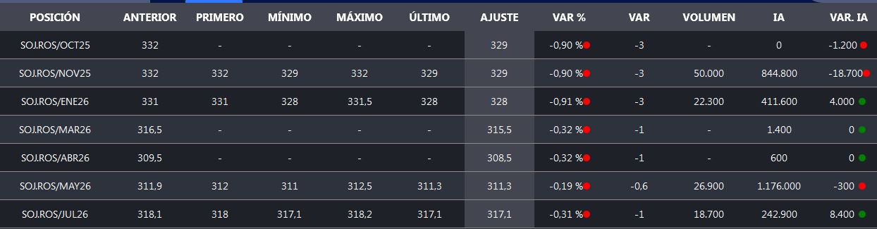 Este viernes la Soja Rosario Mayo 2026 en el mercado A3 terminó en un valor promedio negociado de 311,3 u$s/tonelada con una baja intradiaria del 0,1% y un volumen negociado de 26.900 toneladas.