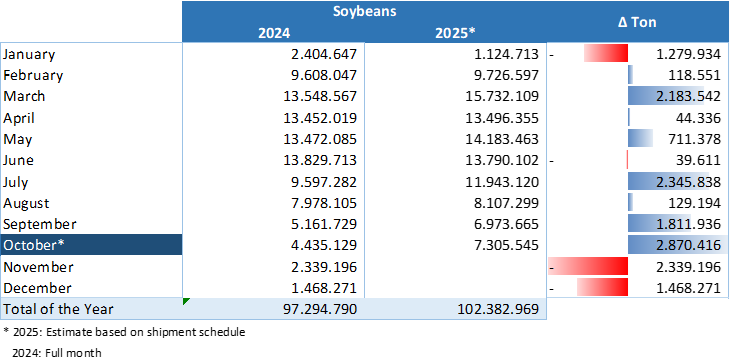 En el presente mes de octubre Brasil planea embarcar un volumen de 7,3 millones de toneladas de soja versus 4,4 millones en el mismo mes de 2024, según estimaciones dela entidad que agrupa a los agroexporadores de ese país (Anec).