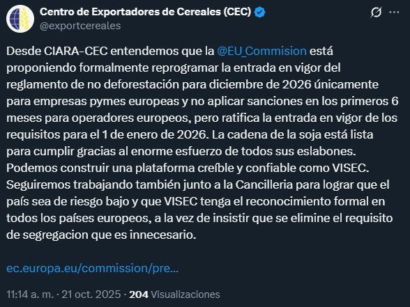 Para evitar incurrir en un nuevo error, Bichos de Campo consultó a Ciara-Cec por este mensaje, quienes aseguraron que la normativa “efectivamente entra en vigor para soja y carne el 1 de enero de 2026”.