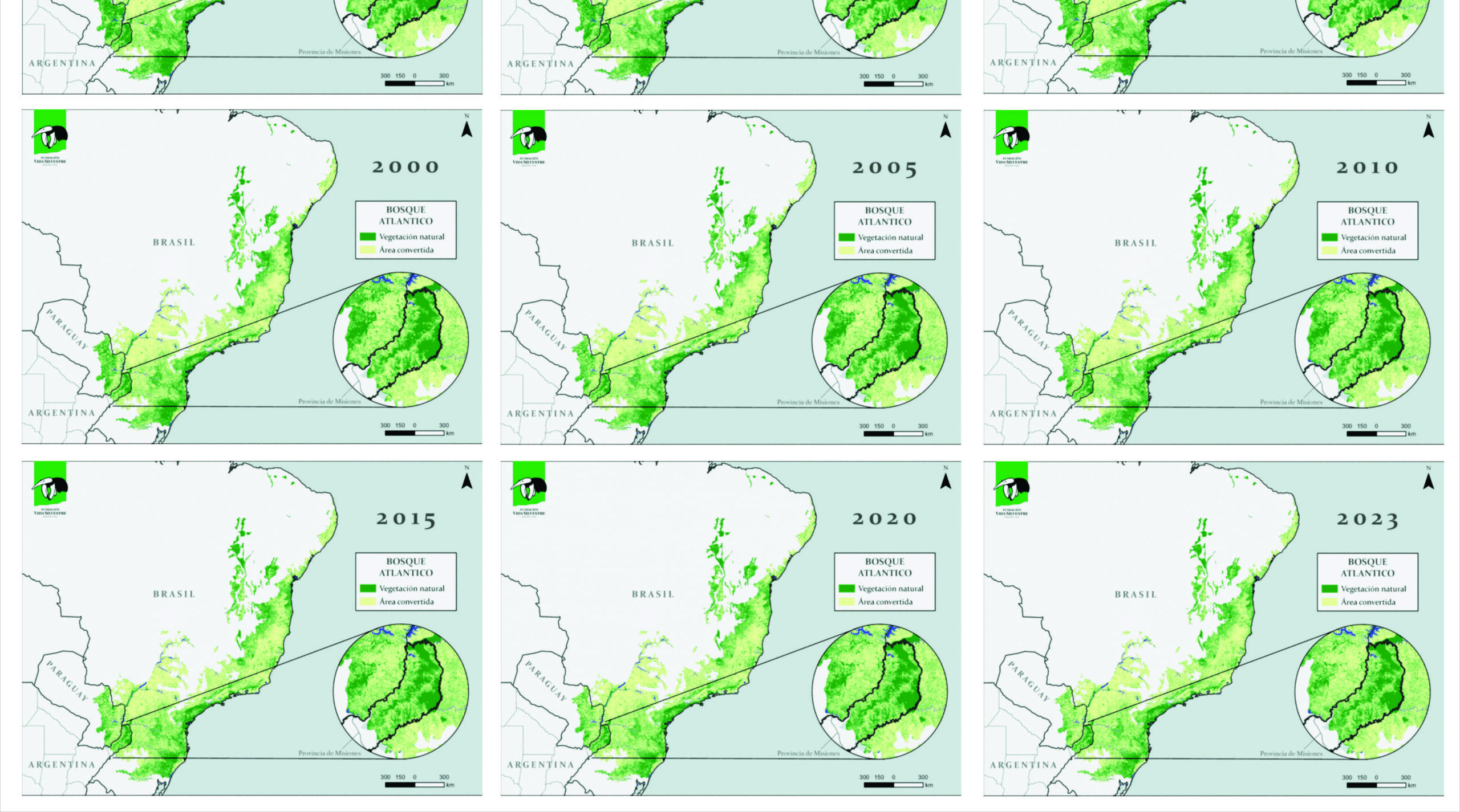 “La superficie perdida es comparable a poco más de 320 veces la superficie de la Ciudad Autónoma de Buenos Aires”, define la entidad ambientalista, como para intentar sensibilizar a los lectores de su trabajo. Esta es la evolución de los mapas: