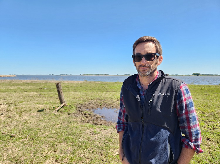“Este que ves acá atrás debería ser un lote mío, pero no, es el río. Allá al fondo, hasta la draga, ese es el borde del río. Acá tenés fácil un metro sesenta o un metro setenta de profundidad. Campo ganadero, pero completamente bajo agua desde la lluvia de mitad de mayo”, cuenta.