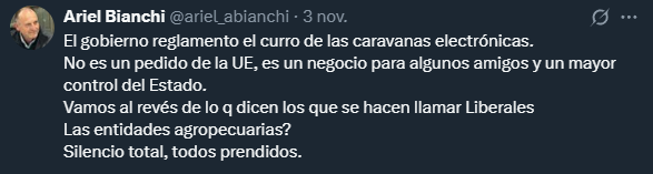 “El gobierno reglamento el curro de las caravanas electrónicas. No es un pedido de la UE, es un negocio para algunos amigos y un mayor control del Estado. Vamos al revés de lo que dicen los que se hacen llamar Liberales. ¿Las entidades agropecuarias? Silencio total, todos prendidos”, publicó el autoconvocado Ariel Bianchi en X.
