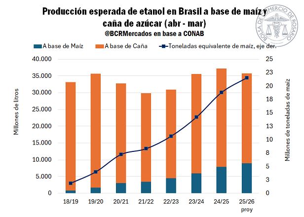 El organismo oficial brasileño Conab proyecta para abril 2025 y marzo 2026 una producción total de 35.700 millones de litros de bioetanol, de las cuales 9000 millones serían elaborados a base de maíz. Eso implicaría el uso de unas 21,5 millones de toneladas del cereal, un 14% más en términos interanuales.