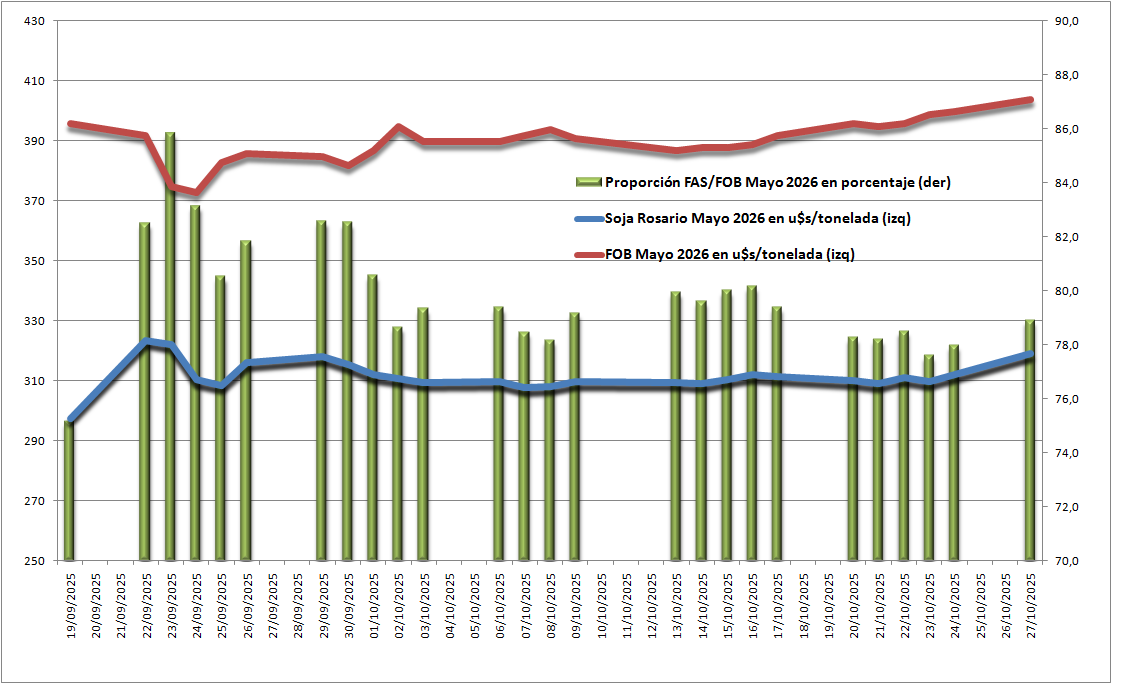 De todas maneras, para tener un marco de referencia, vale mencionar que el valor FAS teórico de la Soja Rosario Mayo 2026 con plena aplicación del derecho de exportación del 24,5% y el precio FOB vigente no superaría los 290 u$s/tonelada.