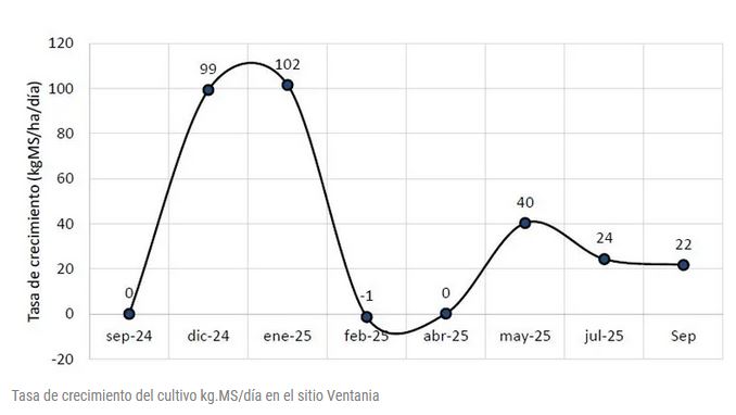 El segundo pico se generó hacia fines de otoño con una tasa de 200 kg.MS/ha/día, momento en que el cultivo entró en el período invernal, caracterizado por tener temperaturas bajas y escasas precipitaciones, donde la tasa de crecimiento comenzó a decrecer.