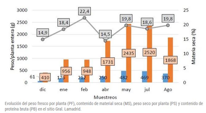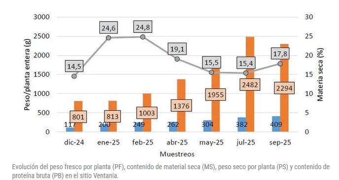 El período de acostumbramiento y los primeros pastoreos se realizaron con alrededor de 13.000 kg.MS/ha. Posteriormente, el peso seco por planta ascendió hasta alcanzar casi 16.000 kg.MS/ha gracias al crecimiento invernal.
