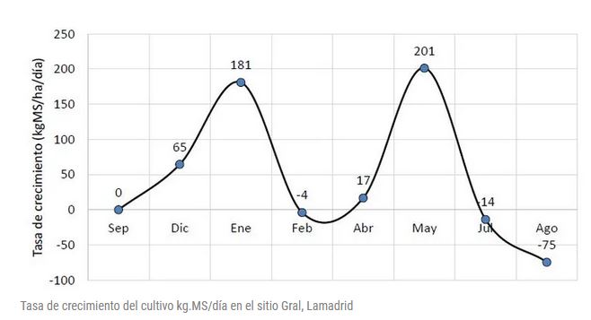 En Gral. Lamadrid, en tanto, el primer pico de la función bimodal se generó en la transición primavera-verano, donde el cultivo armó la estructura aérea para la acumulación de reservas y alcanzó los 180 kg..MS/ha/día en enero.