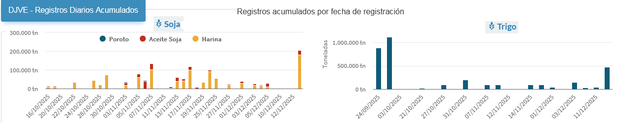 La mayor parte de las DJVE registradas este lunes (700.139 toneladas) fueron con 30 días de plazo de embarque, mientras que las restantes 376.495 toneladas se inscribieron con DJVE-360.