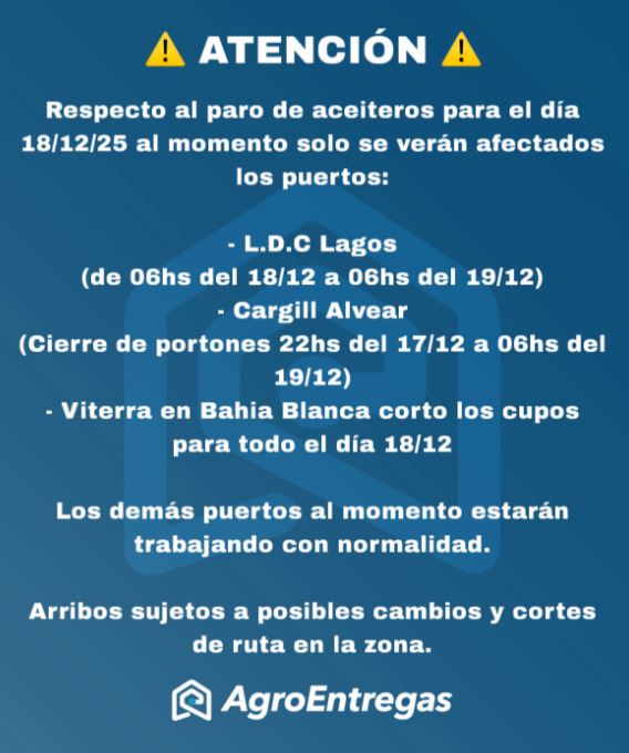 La terminal de Cargill en Gral. Alvear cierra sus portones de acceso a las 22:00 horas del 18 de diciembre para abrirlos a las 6:00 horas del 19 de diciembre. Por último, Viterra en Bahía Blanca suspendió los cupos par toda el día jueves 18 de diciemre.