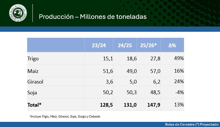 En tanto, la Bolsa de Comercio de Rosario (BCR) difundió este viernes cifras todavía más entusiastas. “Tras varios ciclos atravesados por restricciones climáticas y vaivenes productivos, la campaña 2025/26 aparece como una revancha para el agro argentino. Las estimaciones ubican la producción total de granos en 160 millones de toneladas, consolidando un escenario de fuerte recuperación”, comienza su informe.