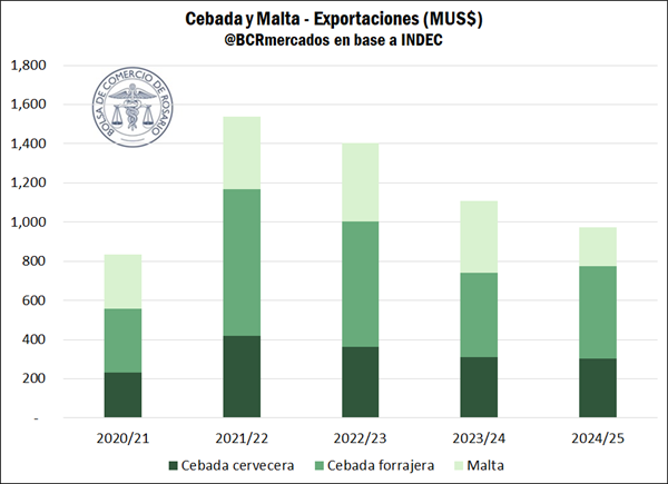 Detrás del maíz y el trigo, la cebada ocupa el tercer puesto entre los complejos exportadores cerealeros y el décimo en el agregado nacional. Se estima que el 1,5% de las divisas que ingresan al país provienen de las ventas de ese cereal y sus principales subproductos.
