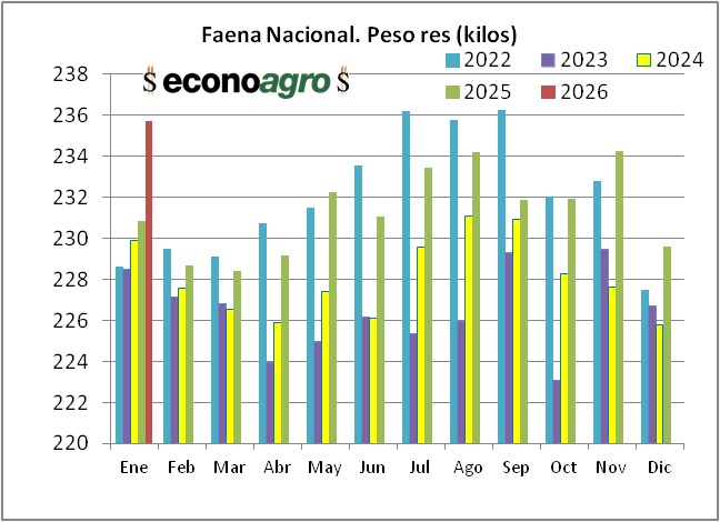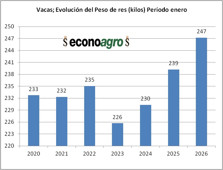 Halle, por su lado, aportó otro gráfico que muestra un violento suba del peso de faena en la categoría vacas en enero pasado. Pasó de 239 kilos promedio en enero del año pasado a 247 kilos en la actualidad. Y es por lejos el más alto de la serie de los últimos años.
