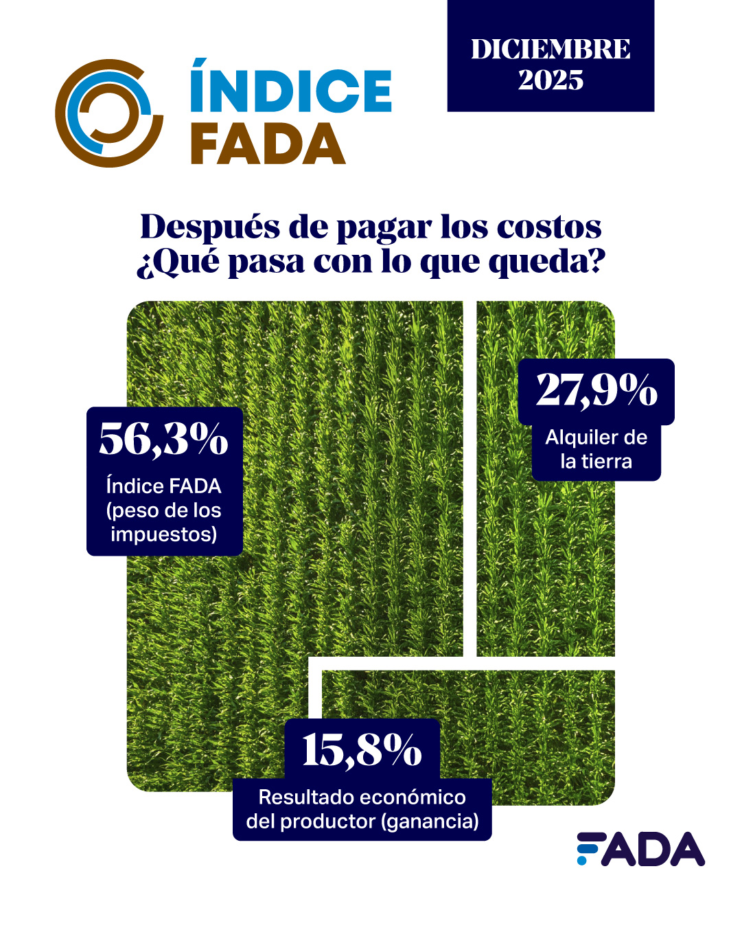 Mientras el Índice FADA nacional es de 56,3%, las provincias muestran diferencias según costos, producción e impuestos locales. Córdoba registra un 54,3%, Buenos Aires 54,5%, Santa Fe 53,5%, La Pampa 53,6%, Entre Ríos 60,3% y San Luis 51,4%.