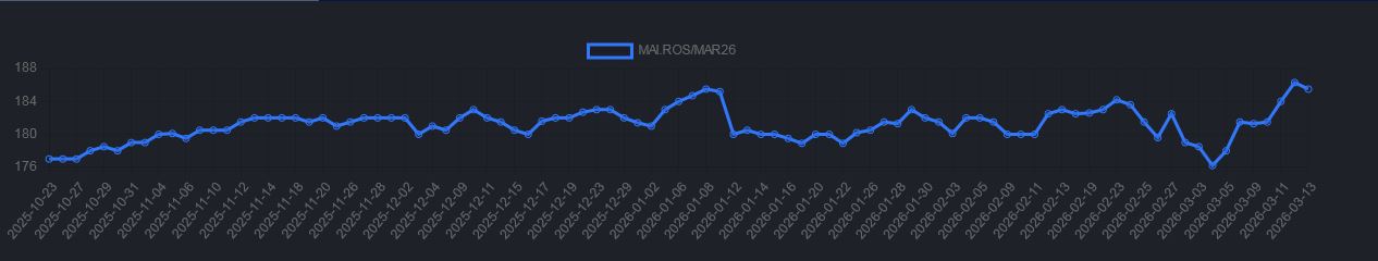 Las estadísticas oficiales muestran que al pasado 4 de marzo los exportadores habían comprado 17,0 millones de toneladas de maíz 2025/26, de los cuales 10,3 millones tienen ya precio hecho. Adicionalmente, el interés abierto de contratos futuros de maíz 2025/26 en el mercado A3 es de 2,40 millones de toneladas.