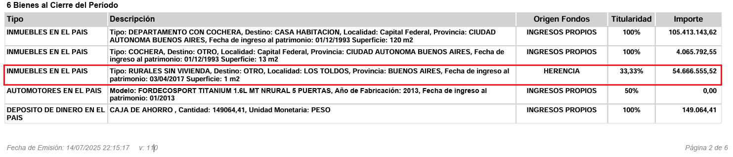 La propiedad, valuada en casi 55 millones de pesos según la declaración jurada presentada en 2024 (menos de 40 mil dólares), figura como obtenida por herencia, de la cual ella posee el 33% de la titularidad. El campo, cuya producción es agrícola-ganadera y ronda las 4.000 hectáreas, integra un patrimonio total que al 31 de diciembre de 2024 equivalía a 177 mil dólares al tipo de cambio oficial.
