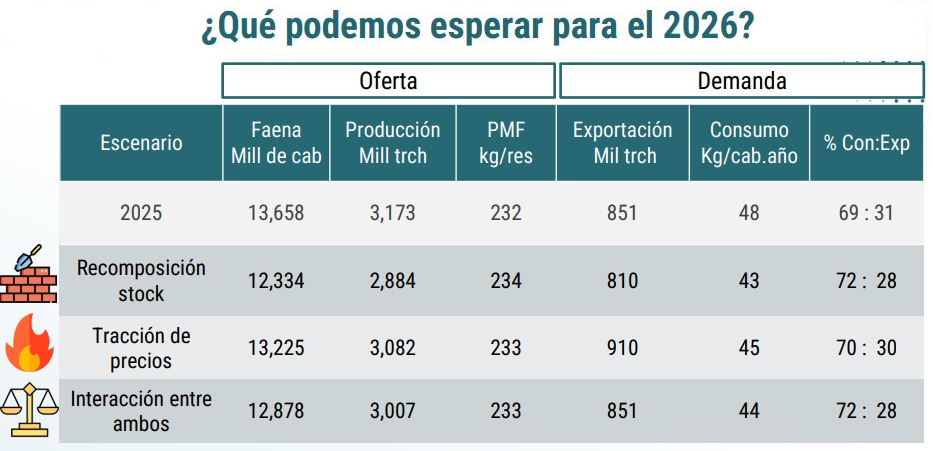 El equipo del área de Ganadería diseñó tres escenarios posibles para el sector en 2026: recomposición de stocks, tracción de precios (dinámica similar a la registrada en 2025) y una combinación entre ambos.
