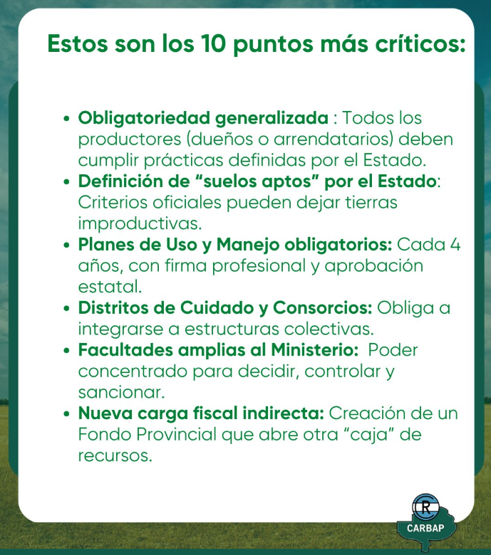 En consonancia con estos puntos, Ignacio Kovarsky, presidente de Carbap, dijo: “Manifestamos nuestro rechazo al proyecto de Ley de Suelos realizado por CIAFBA, porque avanza sobre la propiedad privada, imponiendo controles, sanciones y burocracia que nada aportan al cuidado real del recurso”.