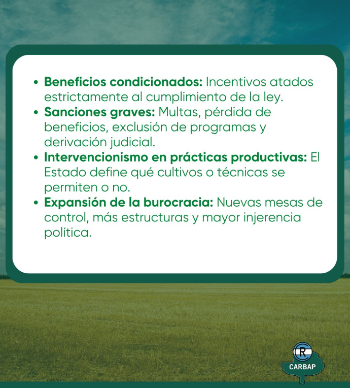 “No decide libremente cómo usar su tierra, sino que está obligado a someterse a planes de manejo supervisados por burócratas y profesionales matriculados. No decide qué sembrar, como planificar su producción, cómo rotar cultivos o cómo manejar sus lotes sin autorización estatal”, indicó.