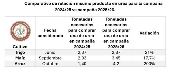 El considerar la situación inicial de la campaña pasada con la actual, relación de intercambio urea/arroz se desplomó, lo que obliga al productor a triplicar la cantidad de grano para acceder al fertilizante. El trigo y el maíz también muestran caídas significativas en su poder de compra, con un deterioro del 21% y 17,7% respectivamente.