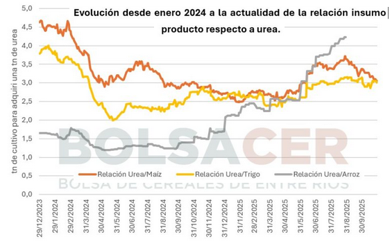 “Este escenario se explica por una combinación de precios de granos a la baja (con el arroz y el trigo en mínimos históricos) y un precio de la urea que, si bien se estabilizó, mostró un pico anual en el momento clave de la siembra de maíz”, señala el informe de la Bolsa de Cereales de Entre Ríos.