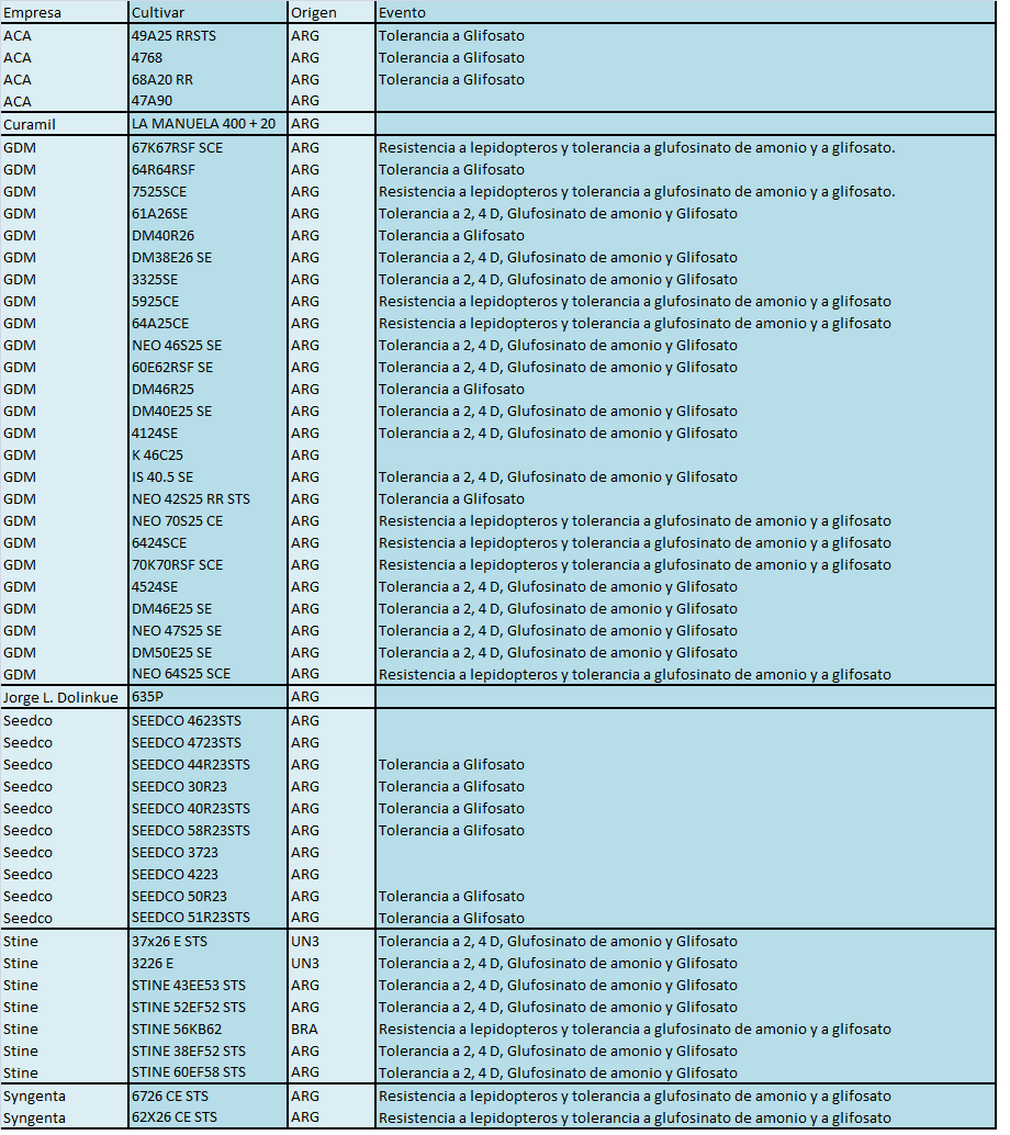 Por otra parte, cinco empresas (ACA, Curamil, GDM, Jorge L. Dolinkue y Seedco) registraron ocho cultivares no transgénicos, lo que evidencia el interés por producir ese producto destinado a consumo humano directo y que se suele exportarse a Europa y Japón.
