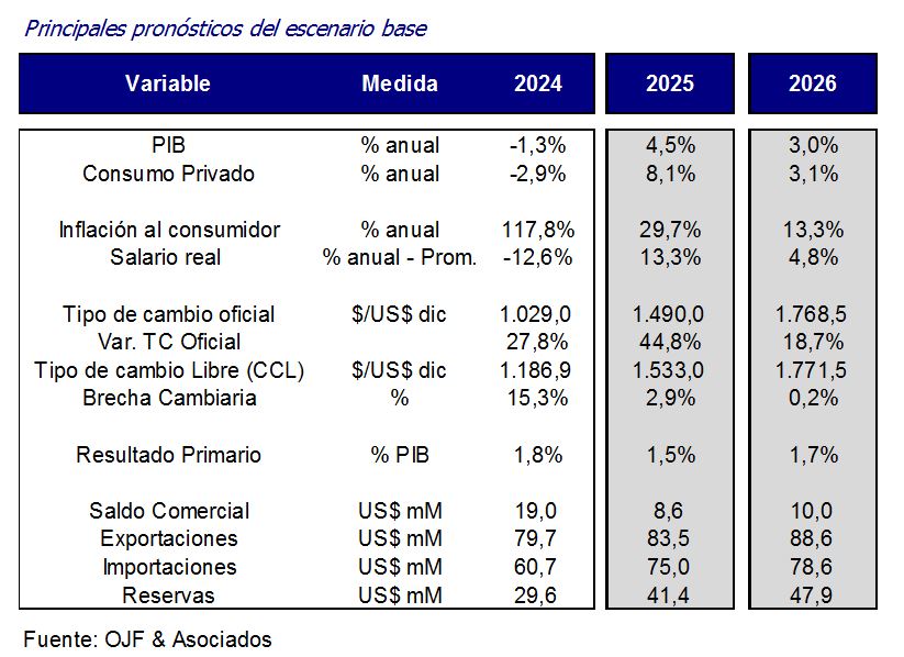 Con los datos disponibles a la fecha, OJF proyecta un tipo de cambio oficial de 1768 $/u$s para fines de 2026 con una inflación minorista que este año sería del 29,7% y que en 2026 registraría un 13,3%.