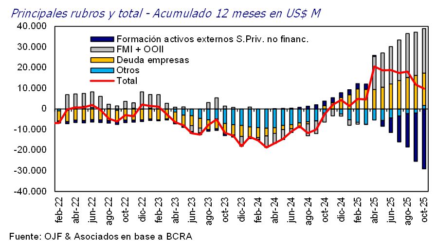 En lo que respecta a la fuente de aporte de divisas para el 2026, el FMI ya no estará presente, para lo cual será clave la generación de dólares por la vía comercial –con el agro a la cabeza–, la toma de deuda por parte de corporaciones privadas (Obligaciones Negociables), las inversiones extranjeras directas (ayudadas por el Régimen de Incentivos a las Grandes Inversiones) y, finalmente, la posibilidad de que el Estado nacional pueda regresar al mercado global de crédito.
