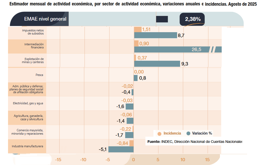 El Estimador Mensual de Actividad Económica (EMAE) determinado por el Indec registró en agosto de 2025 una suba del 2,4% con relación al mismo mes de 2024.