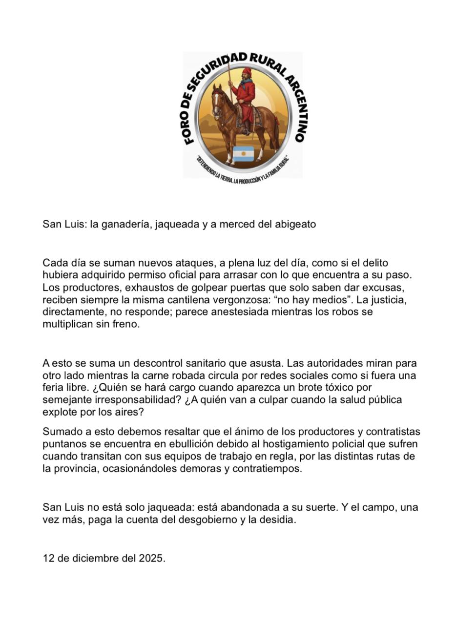 Sobre esta zona en particular, el Foro de Seguridad Rural sugirió que pareciera que el delito “hubiera adquirido permiso oficial para arrasar con lo que encuentra a su paso”, ya que “los robos se multiplican sin freno” en San Luis,m frente a la pasividad de las autoridades.