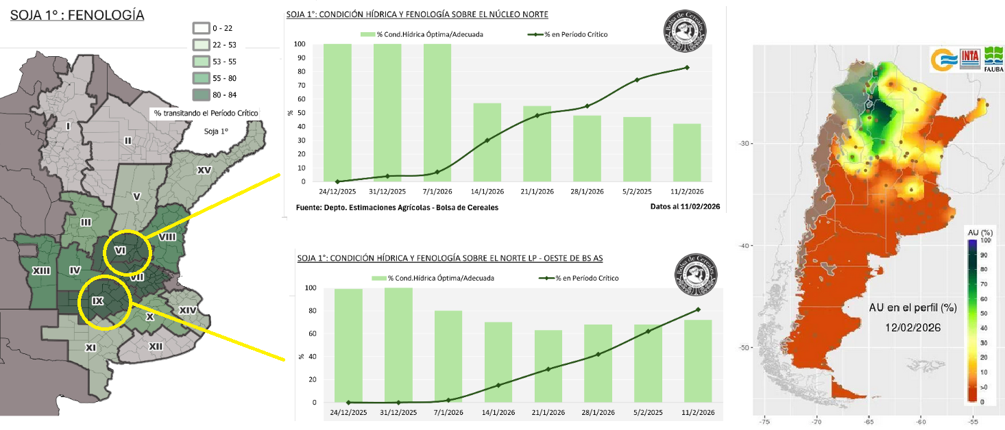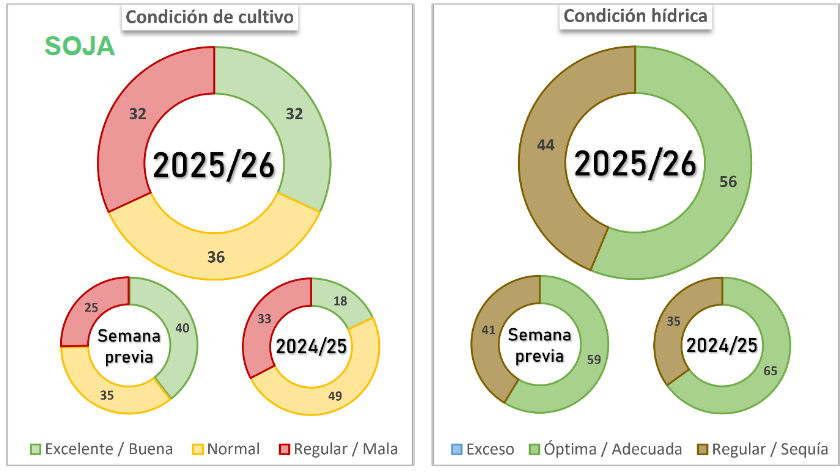 Este jueves la Bolsa de Cereales de Buenos Aires indicó que condición del cultivo de soja argentino en situación regular a mala se incrementó en 6 puntos en la última semana a causa de restricciones hídricas en regiones clave. El 45% del cultivo ya inició el período crítico y depende de precipitaciones para no perder potencial de rendimiento.