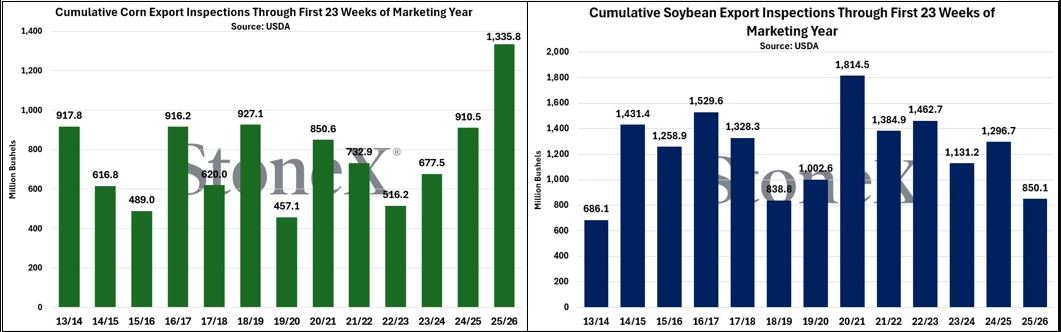 La realidad es que las exportaciones de soja estadounidense siguen atrasadísimas. En términos relativos, hasta el 5 de febrero se habían embarcado el 54% de la oferta exportable estimada por el USDA para el ciclo 2025/26 que finaliza el próximo 31 de agosto.