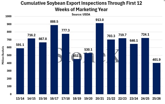 En ese marco, los compromisos comerciales de soja estadounidense 2025/26 a la fecha suman 10,9 millones de toneladas, una cifra 44% inferior a la registrada en la misma fecha del año pasado y la más baja de los últimos doce años, según datos oficiales recopilados por la consultora StoneX.