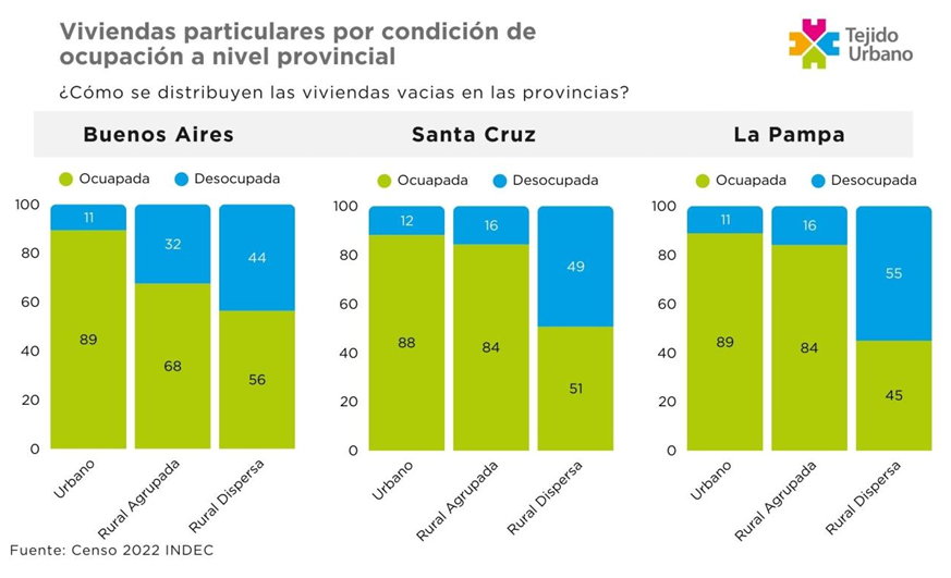 Pero en La Pampa y Santa Cruz la situación de las zonas rurales es aún más dura. Mientras que en ambas el porcentaje de viviendas desocupadas en zonas urbanas es del 11%, y el porcentaje solo sube al 15% en zonas rurales agrupadas (con más de 2 mil habitantes), en las zonas rurales dispersas (con menos de 2 mil habitantes) el número impacta: en Santa Cruz, el 49,35% de las viviendas se encuentran vacías, mientras que en La Pampa el número llega al 55,05%. Esto se traduce en 1 de cada 2 viviendas.