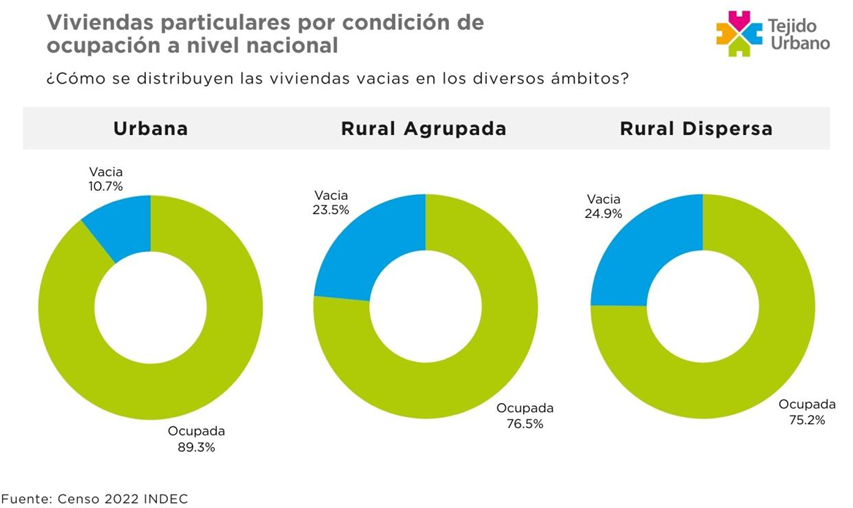 A continuación, profundizó el análisis: “Su distribución entre el ámbito urbano y rural es fuertemente desigual. Mientras que las viviendas vacías dentro del ámbito urbano, a nivel nacional, representan un 10,69%; en el ámbito rural ese porcentaje sube al 24,24%. Esto quiere decir que, mientras que en las ciudades, cada 100 viviendas, hay en promedio, casi 11 vacías; en las zonas rurales, el número aumenta a 25”.