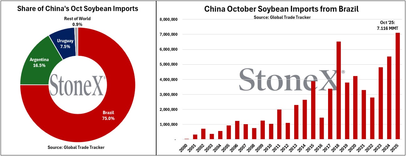 Los últimos datos oficiales de China muestran que en octubre pasado las importaciones de soja fueron descomunales para sumar 9,4 millones de toneladas, la mayor parte de las cuales provinieron de Brasil, aunque también fueron, en términos estacionales, inusualmente elevadas para la Argentina y Brasil.