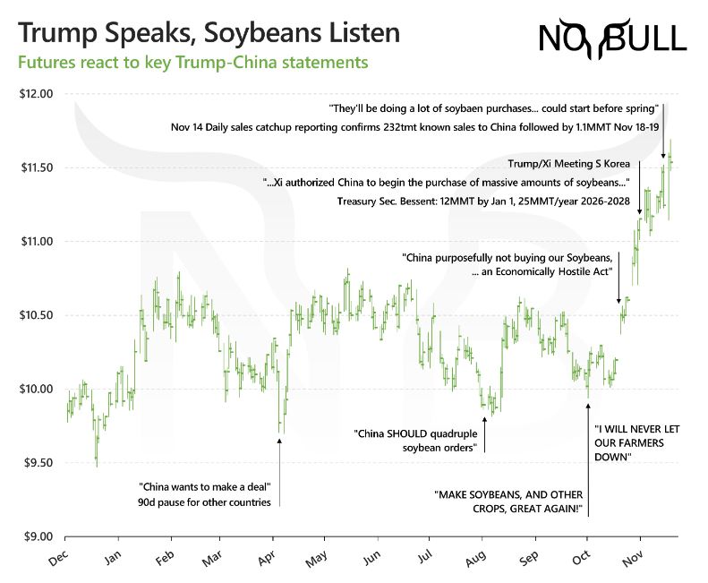 La consultora estadounidense Susan Stroud elaboró un gráfico en el cual puede advertirse cómo las subas de la soja estadounidense en el último mes están fundamentalmente sostenidas en base a expectativas construidas en base a declaraciones públicas de Trump o de funcionarios de su gestión.